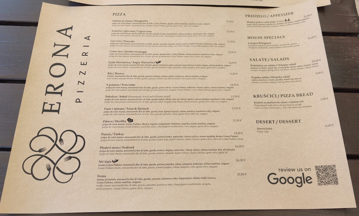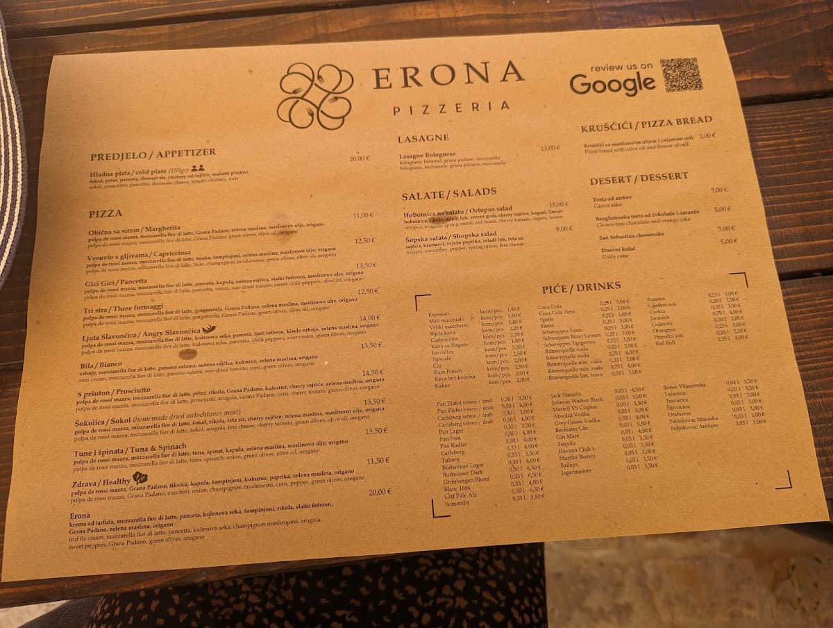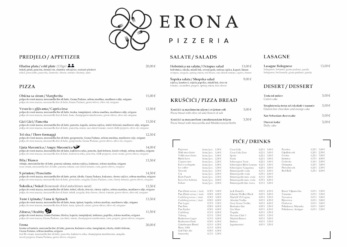 Welcome to Pizzeria ERONA, a culinary gem nestled in the heart of Nin, Croatia. Located at Trg Kraljevac 4, this charming restaurant is renowned for its exceptional wood-fired pizzas, crafted with high-quality ingredients that create a symphony of flavors.
